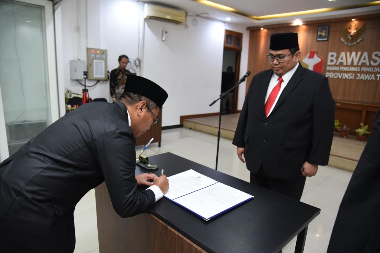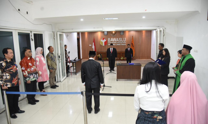 Surabaya, Badan Pengawas Pemilihan Umum- Ketua Bawaslu Rahmat Bagja melantik sekaligus mengambil sumpah Pengganti Antar-waktu (PAW) tiga anggota Bawaslu. Dia meminta para terantik untuk segera bekerja serta berkoordinasi dengan lembaga terkait, mengingat sebentar lagi akan memasuki tahapan pemungutan suara Pemilihan 2024.