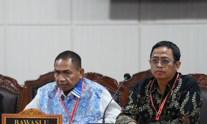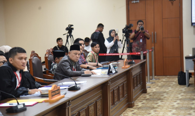 Jakarta, Badan Pengawas Pemilihan Umum- Dua pimpinan Bawaslu, Puadi dan Totok Hariyono menghadiri sidang gugatan sengketa hasil tujuh daerah yang melaksanakan Pemungutan Suara Ulang (PSU) Pemilihan 2024 di Mahkamah Konstitusi (MK), Jumat (25/4/2025). Sidang pendahuluan dengan agenda mendengarkan dalil permohonan ini terbagi dalam tiga panel, masing-masing panel dipimpin tiga majelis hakim MK.