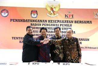 Para pimpinan lembaga negara yang terdiri dari Badan Pengawas Pemilihan Umum, Komisi Pemilihan Umum, Komisi Penyiaran Indonesia, dan Komisi Informasi Pusat sedang melaksanakan penandatanganan nota kesepahaman tentang pelaksanaan kampanya melalui media penyiaran.