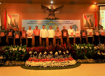 Ketua Bawaslu Abhan menerima opini WTP atas Laporan Hasil Pemeriksaan (LHP) Laporan Keuangan Kementerian/Lembaga tahun 2018 dari Anggota I BPK Agung Firman Sampurna di Auditorium Bandiklat BPK RI, Kalibata, Jakarta, Kamis (20/6/2019).