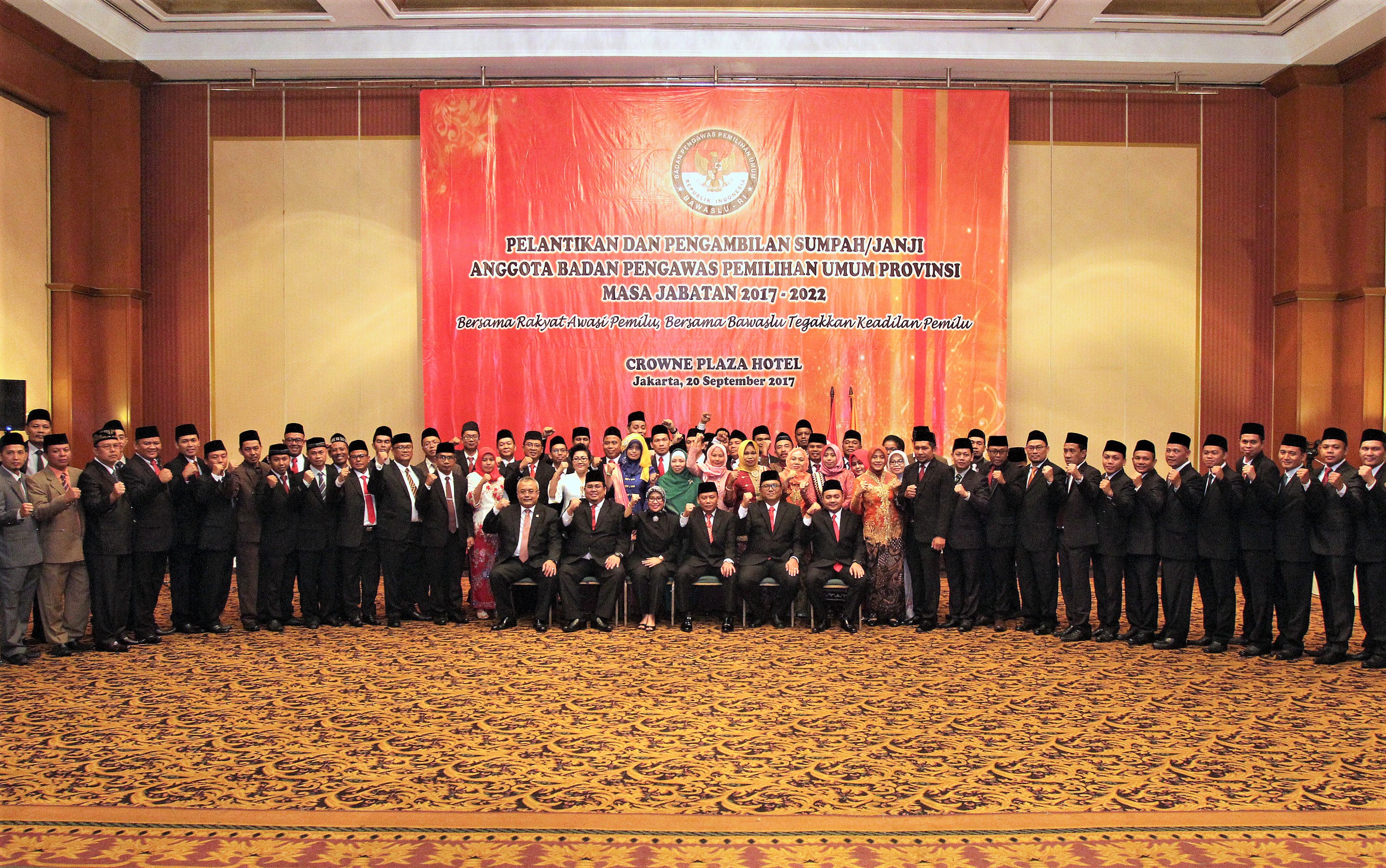 Jakarta, Badan Pengawas Pemilihan Umum - Sebanyak 72 orang anggota Bawaslu Provinsi terpilih masa jabatan 2017 - 2022 dari 24 provinsi dilantik dan diambil sumpah/janjinya oleh Ketua Bawaslu RI Abhan, Rabu (20/9) di Crowne Hotel Jakarta.