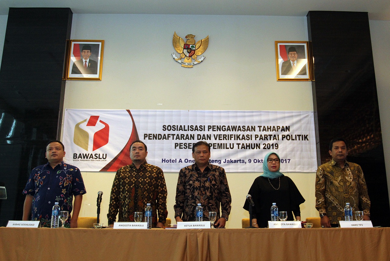 Jakarta, Badan Pengawas Pemilu - Sebagai bagian dari pelaksanaan fungsi pencegahan, Badan Pengawas Pemilu (Bawaslu) menggelar kegiatan Sosialisasi Pengawasan Tahapan Pendaftaran dan Verifikasi Partai Politik Peserta Pemilu Tahun 2019 di Jakarta, Senin (9/10/2017). Kegiatan ini mengundang 73 partai politik yang terdaftar di Kementerian Hukum dan Hak Asasi Manusia.