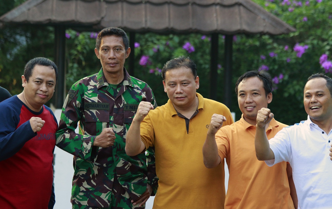 Bogor, Badan Pengawas Pemilu-Ketua Bawaslu RI, Abhan melakukan senam pagi bersama para anggota Bawaslu Provinsi terpilih masa jabatan 2017-2022 di halaman Aston Bogor Hotel ann Resort, Bogor, Jawa Barat, Minggu (24/9/2017). Senam tersebut dipimpin oleh instruktur Markas Komando dan Latihan Pasukan Pengaman Presiden (Makodenlat Paspamres) Group C.