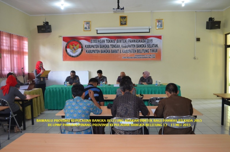 Pangkalpinang, Bawaslu Babel - Badan Pengawas Pemilu Provinsi Kepulauan Bangka Belitung telah menyelenggarakan Bimtek (bimbingan teknis) bagi seluruh Anggota Panitia Pengawas Pemilihan Kepala Daerah (Panwas Pilkada) dan Kepala Sekretariat serta Bendahara 4 (empat) kabupaten, diantaranya: Kabupaten Bangka Tengah, Kabupaten Bangka Selatan, Kabupaten Bangka Barat dan Kabupaten Belitung Timur. Bertempat di Gedung Lembaga Penjamin Mutu Pendidikan (LPMP) Provinsi Kepulauan Bangka Belitung, acara berlangsung pada tanggal 12-13 Mei 2015. Kegiatan ini dilaksanakan agar Panwas Kabupaten mendapatkan bekal yang cukup dalam melaksanakan tugas pengawasan Pilkada 2015. “Bimtek ini untuk mengasah kembali pengetahuan teknis tentang pengawasan karena strategi kita dalam Pilkada ini bukan untuk menyelesaikan masalah, tapi untuk mencegah terjadinya masalah (pelanggaran-red)”, ujar Komisioner Bawaslu Babel, Bagong Susanto dalam sambutannya.
