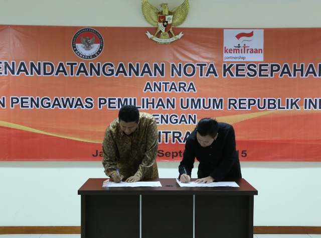 Jakarta, Badan Pengawas Pemilu – Badan Pengawas Pemilihan Umum Republik Indonesia (Bawaslu RI) menandatangani nota kesepahaman dengan The Partnership Governance Reform (Kemitraan) melingkupi pengembangan pusat data dan informasi pengawasan, penanganan pelanggaran dan penyelesaian sengketa pemilu online, Kamis (17/9). Nota kesepaham ini menandai dimulainya kerjasama antara Bawaslu dengan Kemitraan untuk meningkatkan kualitas demokrasi di Indonesia.