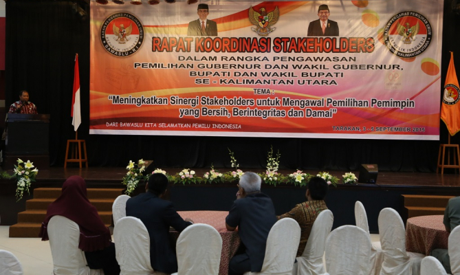 Tarakan, Badan Pengawas Pemilu – Badan Pengawas Pemilu Republik Indonesia (Bawaslu RI) menggelar Rapat Koordinasi Stakeholders dalam rangka pengawasan pemilihan Gubernur, Bupati dan Walikota serentak tahun 2015 di provinsi termuda di Indonesia, Provinsi Kalimantan Utara, Kamis (3/9). Rapat koordinasi diharapkan dapat meningkatkan sinergitas semua pemangku kepentingan untuk mengawal pilkada yang bersih, berintegritas dan damai.