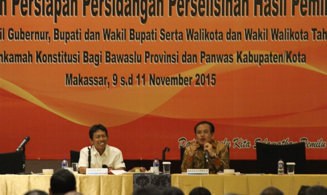 Hakim Mahkamah Konstitusi, Prof. Dr. Aswanto saat memaparkan materi pada Pembekalan Persiapan Persidangan Perselisihan Hasil Pemilihan Kepala Daerah gelombang III bagi Bawaslu Provinsi dan Panwas Kabupaten/Kota, di Makassar, Selasa, (10/11).