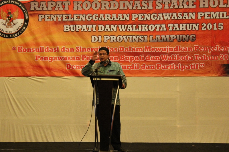Bandar Lampung, Badan Pengawas Pemilu - Bawaslu Provinsi Lampung menggelar Rapat Koordinasi Penyelenggaraan Pengawasan Pemilihan Bupati dan Walikota di Ballroom Hotel Novotel, Telukbetung Selatan, Bandar Lampung, Rabu, (20/5). Bertema ‘Konsolidasi dan Sinergitas dalam Mewujudkan Penyelengaraan Pengawasan Pemilihan Bupati dan WaliKota Tahun 2015 dengan Luber, Jurdil, dan Partisipatif’, kegiatan tersebut dibuka langsung oleh Ketua Bawaslu RI, Muhammad.