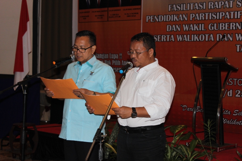 Dalam rangkaian acara Rapat Koordinasi Stakeholders Dalam Rangka Pendidikan Partisipatif Pengawasan Pemilhan Gubernur/Wakil Gubernur, Bupati/Wakil Bupati, Walikota/Wakil Walikota Se-Provinsi Jambi Tahun 2015, Senin (23/11), dua paslon yang berhalangan hadir diwakili oleh tim pemenangannya ketika membacakan komitmen secara bersama-sama.