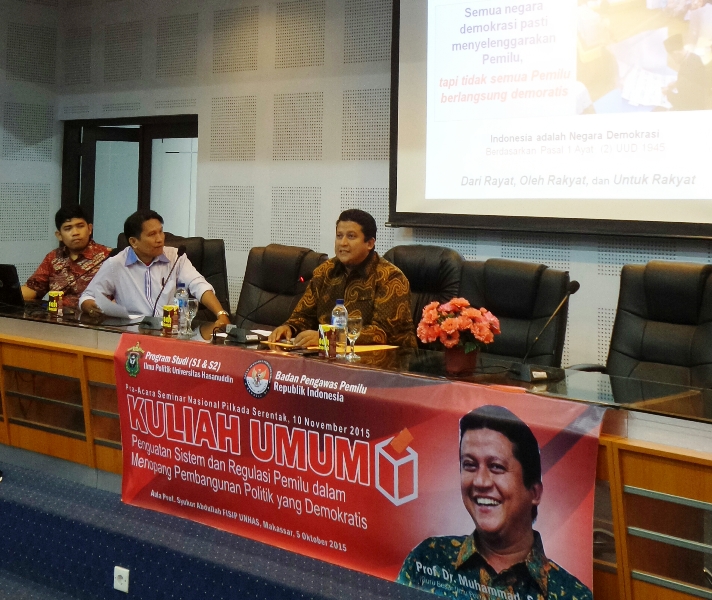 Hal ini disampaikan Ketua Bawaslu RI Muhammad dalam kuliah umum mengenai Penguatan Sistem dan Regulasi Pemilu Dalam Menopang Pembangunan Politik Yang Demokratis di hadapan mahasiswa pasca sarjana dan mahasiswa strata satu Fakultas Ilmu Sosial dan Politik Universitas Hasanuddin (Unhas) Makassar, Senin (5/10) yang dibuka Ketua program Studi Fisip Unhas, Prof. Muh. Kausar Bailusy, M.A. dan dihadiri Pembantu Dekan Fisip Unhas Dr. Gustiana A. Kambo, SIP.,M.Si.