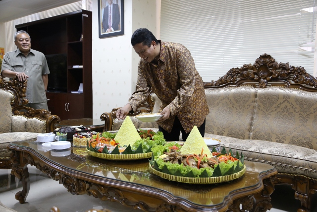 Dengan wajah berseri  Pak Ketua memotong kue dan tumpeng yang telah disiapkan. Tak lupa ia menyampaikan harapannya ke depan serta menyisipkan kabar bahagia dari keluarganya yang membuat semua yang hadir siang itu mengembangkan senyum.