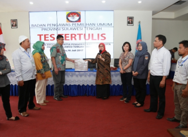 Palu, Badan Pengawas Pemilu -Serah terima naskah soal tes tertulis yang tersegel rapi diberikan oleh tim dari Bawaslu RI kepada ketua Tim seleksi calon anggota Panitia Pengawas Kabupaten/Kota Provinsi Sulawesi Tengah Dr. Lukman Najamuddin, M.Hum disaksikan oleh Anggota Bawaslu RI Dr. Ratna Dewi Pettalolo dan Ketua Bawaslu Provinsi Asrifai S.IP., M.Si. di Kampus Universitas Tadulako, Sabtu (15/7).