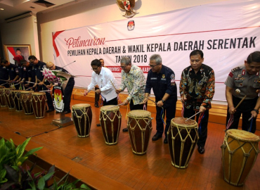 Jakarta, Badan Pengawas Pemilu- Bertempat di Ruang Sidang Utama Gedung KPU RI, Jl. Imam Bonjol Menteng, Jakarta Pusat, Rabu (14/6), KPU RI resmi meluncurkan Tahapan Pemilihan Kepala Daerah dan Wakil Kepala Daerah Serentak tahun 2018. Ketua Bawaslu RI Abhan, Dirjen Otonomi Daerah Sonni Sumarsono, Wassintel TNI AD Brigjen Andjar Wiraatma, serta Asops Mabes Polri Irjen Pol Unggung Cahyono yang turut hadir dalam peluncuran Tahapan Pilkada 2018 turut memukul perkusi bersama Ketua dan Anggota KPU RI sebagai tanda diluncurkannya Tahapan Pilkada 2018.