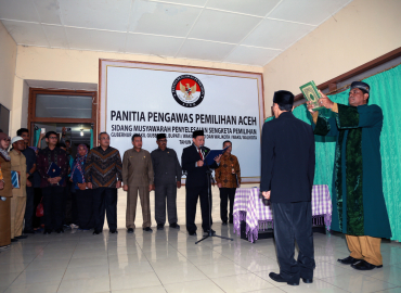 Banda Aceh, Badan Pengawas Pemilu – Ketua Bawaslu Abhan melantik Pengganti Antar Waktu (PAW) Anggota Panitia Pengawas Pemilihan (Panwaslih) Aceh Fahrul Rizha Yusuf di Kantor Panwaslih Aceh, Banda Aceh, Senin (15/5). Pelantikan mantan Ketua Panwaslu Kabupaten Aceh Barat Daya pada Pemilu 2014 sebagai Anggota Panwaslih Aceh tersebut, menggantikan anggota yang lama yang berdasarkan putusan DKPP RI nomor 17/DKPP-PKE-VI/2017 menjatuhkan sanksi berupa pemberhentian.
