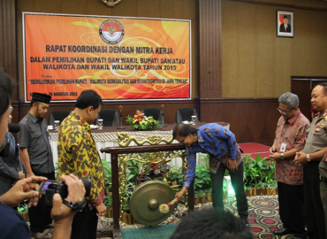 SEMARANG, BAWASLU JATENG - Pasangan Calon (Paslon) Bupati dan Wakil Bupati serta Walikota dan Wakil Walikota yang berasal dari 20 Kabupaten/Kota menyatakan akan melakukan kampanye damai melalui pendandatanganan deklarasi yang diinisiasi oleh Bawaslu Provinsi Jawa Tengah. Peristiwa penandatangan tersebut terjadi dalam Rapat Koordinasi dengan Mitra Kerja dalam Pemilihan Bupati dan Wakil Bupati serta Walikota dan Wakil Walikota Tahun 2015 pada Rabu 26 Agustus 2015 di Hotel Semesta Semarang.