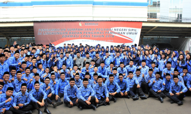 Jakarta, Badan Pengawas Pemilihan Umum - Bawaslu melantik sebanyak 263 Pegawai Negeri Sipil (PNS) di lingkungan Bawaslu dari seluruh provinsi se Indonesia. Sekretaris Jenderal Bawaslu Gunawan Suswantoro melantik sekaligus mengambil sumpah atau janji para abdi negara yang berasal dari formasi CPNS tahun 2018 atau angkatan ketiga.
