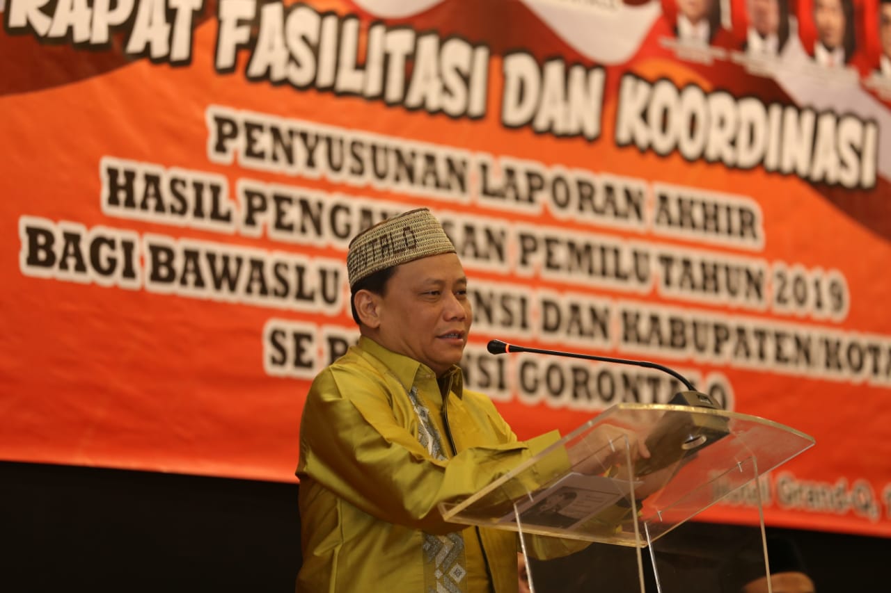 Ketua Bawaslu Abhan saat memberikan sambutan dalam Rapat Fasilitasi dan Koordinasi Laporan Akhir Hasil Pengawasan Pemilu 2019 di Gorontalo, Minggu 14 Juli 2019/Foto: Muhtar