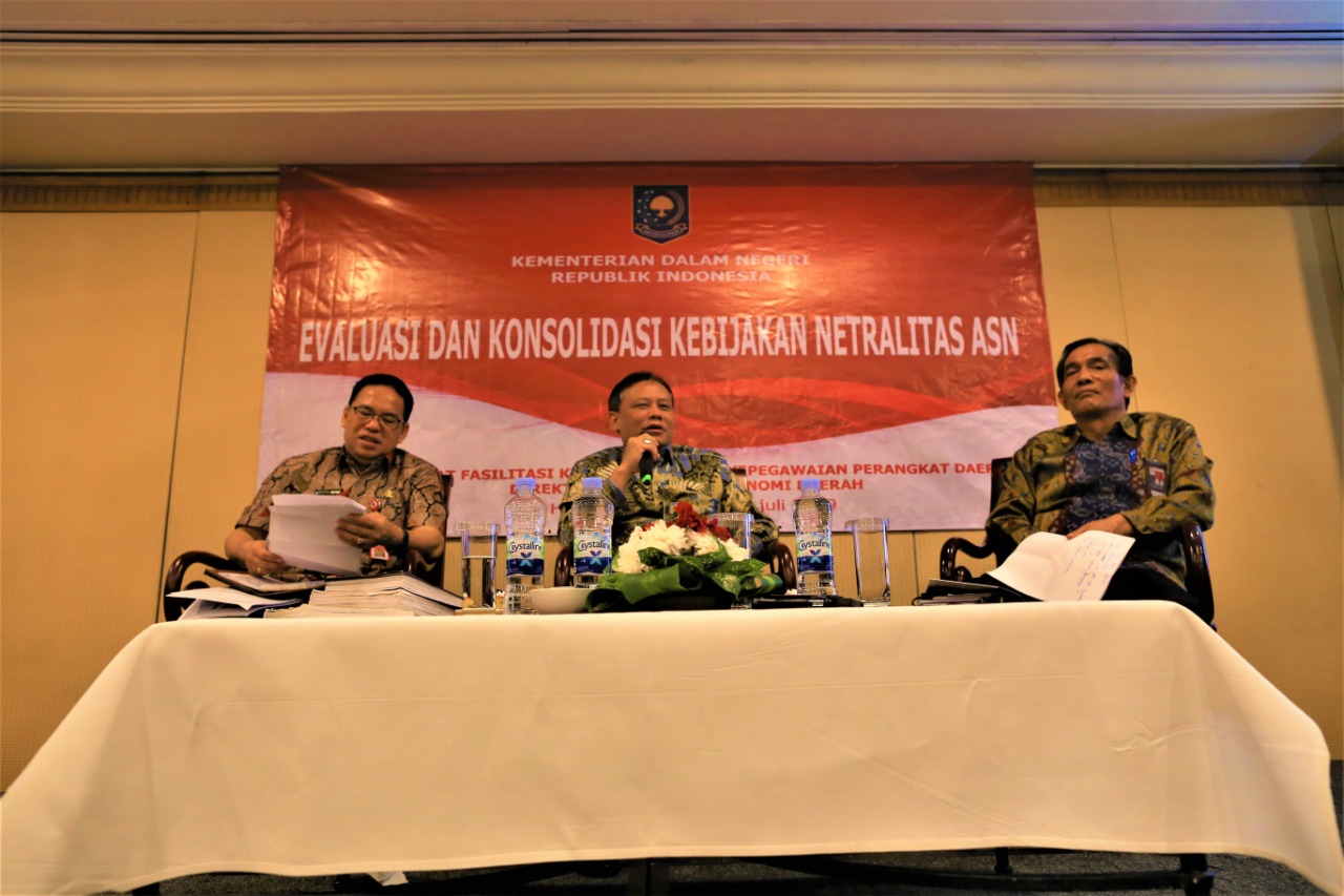 Ki-kan: Direktur FKKPD Fasilitasi Kelembagaan dan Kepegawaian Perangkat Daerah Makmur Marbun, Ketua Bawaslu Abhan, dan Asisten Komisioner ASN Pangihutan Marpaung dalam acara Evaluasi dan Konsilidasi Kebijakan Netralitas ASN Jakarta, Jumat 12 Juli 2019/Foto: Abdul Hamid