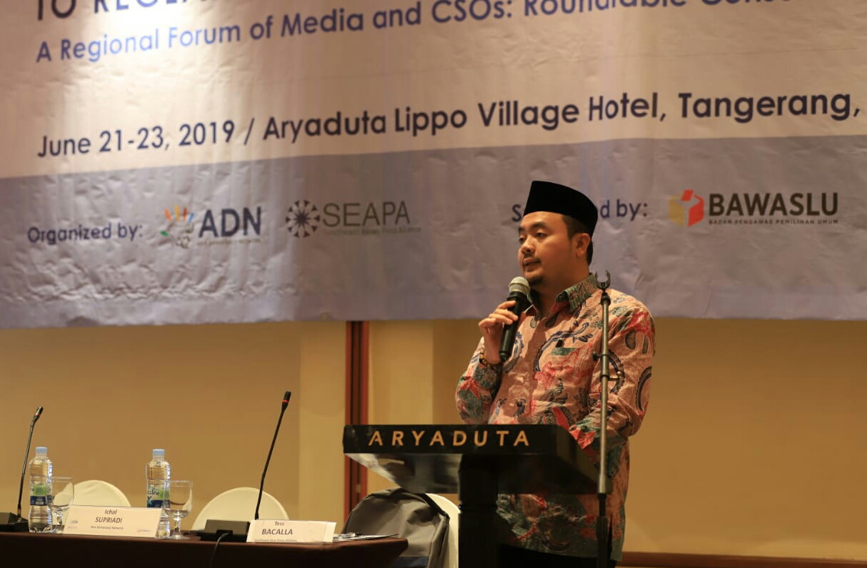 Anggota Bawaslu Mochammad Afifudin saat menjadi pembicara A Regional Forum of Media and CSOs Roundtable Consultan Meeting di Tangerang, Jumat 21 Juni 2019/Foto: Hendi Purnawan