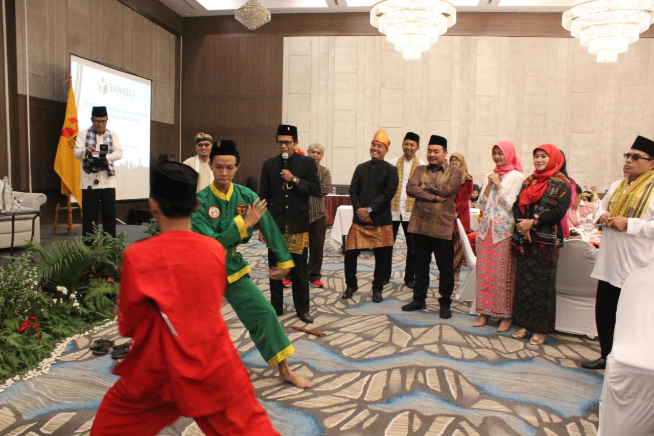 Anggota Bawaslu M Afifuddin mendapat sambutan pencak silat saat menghadiri acara Pengembangan Pengawasan Partisipatif Berbasis Budaya yang diselenggarakan Bawaslu DKI Jakarta, Sabtu 14 Desember 2019/Foto: Abdul Hamid