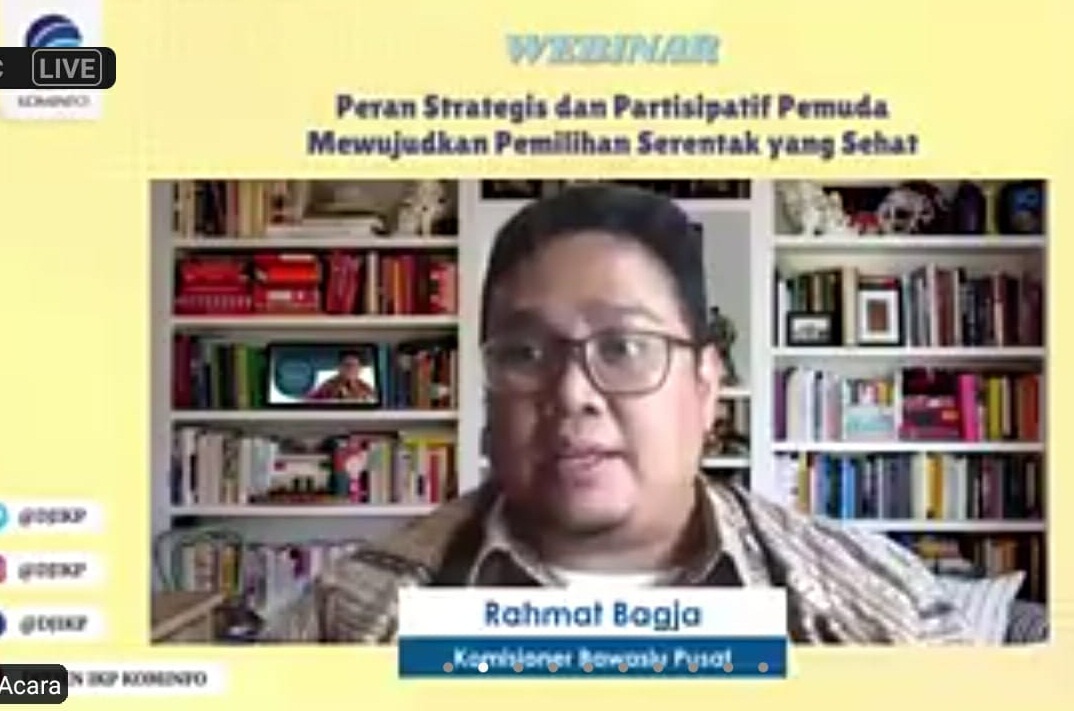 Jakarta, Badan Pengawas Pemilihan Umum - Berbagai potensi pelanggaran Pilkada Serentak 2020 yang berbarengan dengan pandemi covid-19, Anggota Bawaslu Rahmat Bagja mengajak para pemuda aktif mengawasi. Menurutnya pemantauan dari kalangan pemuda agar menyadarkan pemilih sebagai tangung jawab menentukan arah pembangunan bangsa Indonesia lima tahun mendatang.
