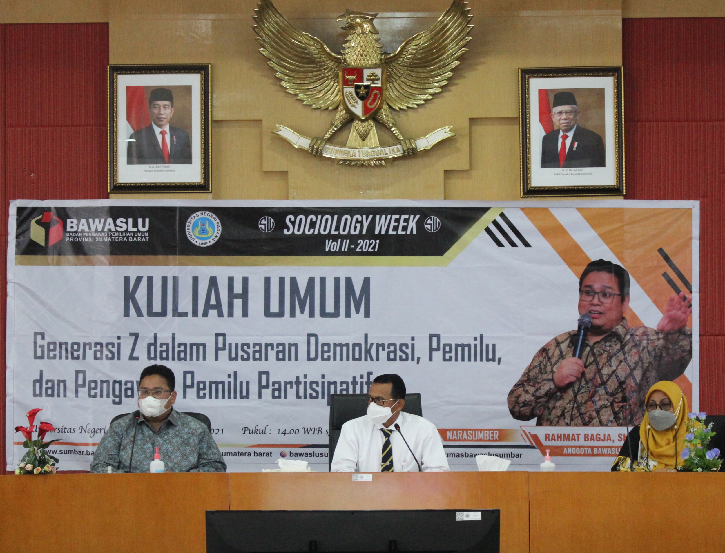 Anggota Rahmat Bagja menjadi narasumber dalam kegiatan Pendidikan Pengawasan Pemilu di Lingkungan Akademik, bertema Generasi Z dalam Pusaran Demokrasi, Pemilu, dan Pengawas Pemilu di Universitas Negeri Padang, Senin, (15/11/2021).