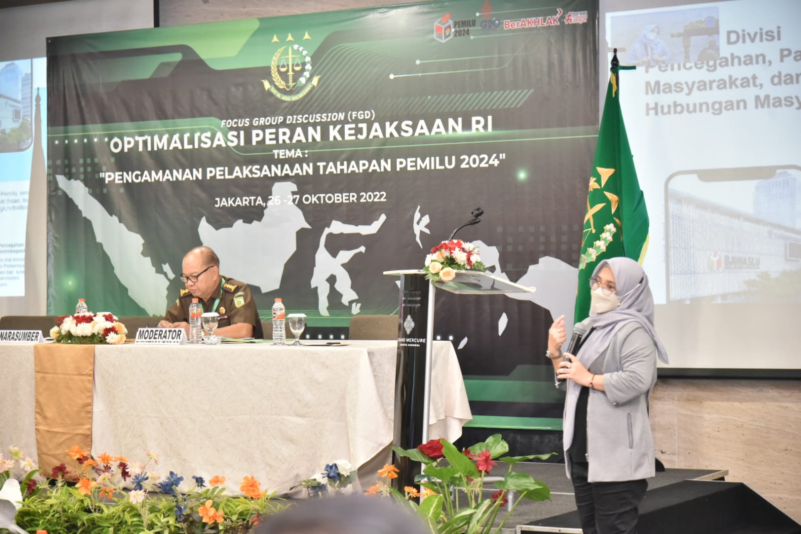 Jakarta, Badan Pengawas Pemilihan Umum - Anggota Bawaslu Lolly Suhenty mengajak jajaran kejaksaan menyukseskan Pemilu 2024 dengan turut mencegah terjadinya pelanggaran. Menurutnya berdasarkan hasil mitigasi ada empat konsentrasi pencegahan oleh Bawaslu yang meliputi hoaks atau berita bohong, politik uang, politisasi SARA (suku, agama, ras dan antargolongan), dan