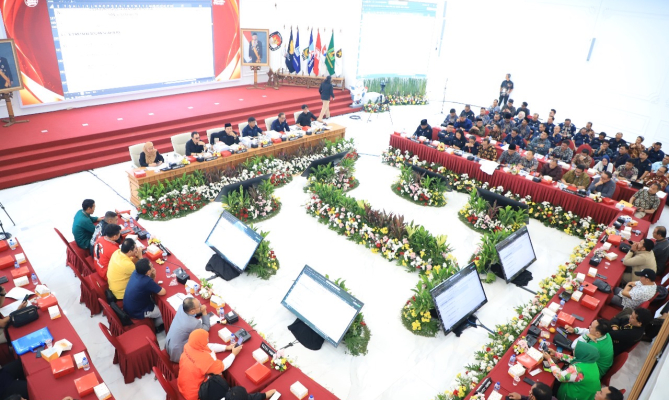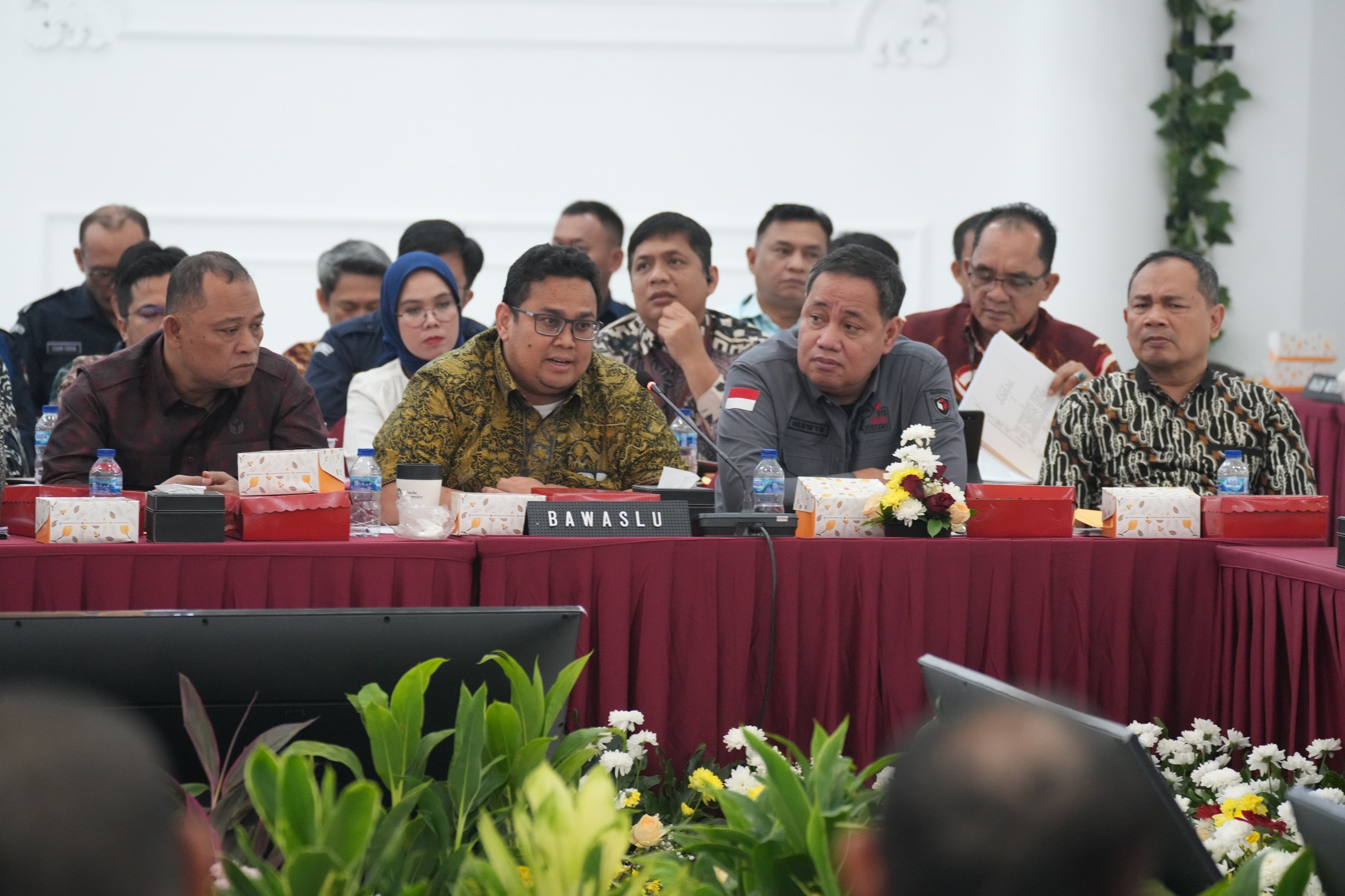 Ketua Bawaslu Rahmat Bagja (dua depan dari kiri) bersama anggota dan sekjen Bawaslu (berurutan kiri ke kanan) Totok Hariyono, Herwyn JH Malonda, dan Ichsan Fuady mengawasi sidang pleno di ruang rapat KPU, Jakarta, Minggu (28/7/2024)/foto: Publikasi dan Pemberitaan Bawaslu.