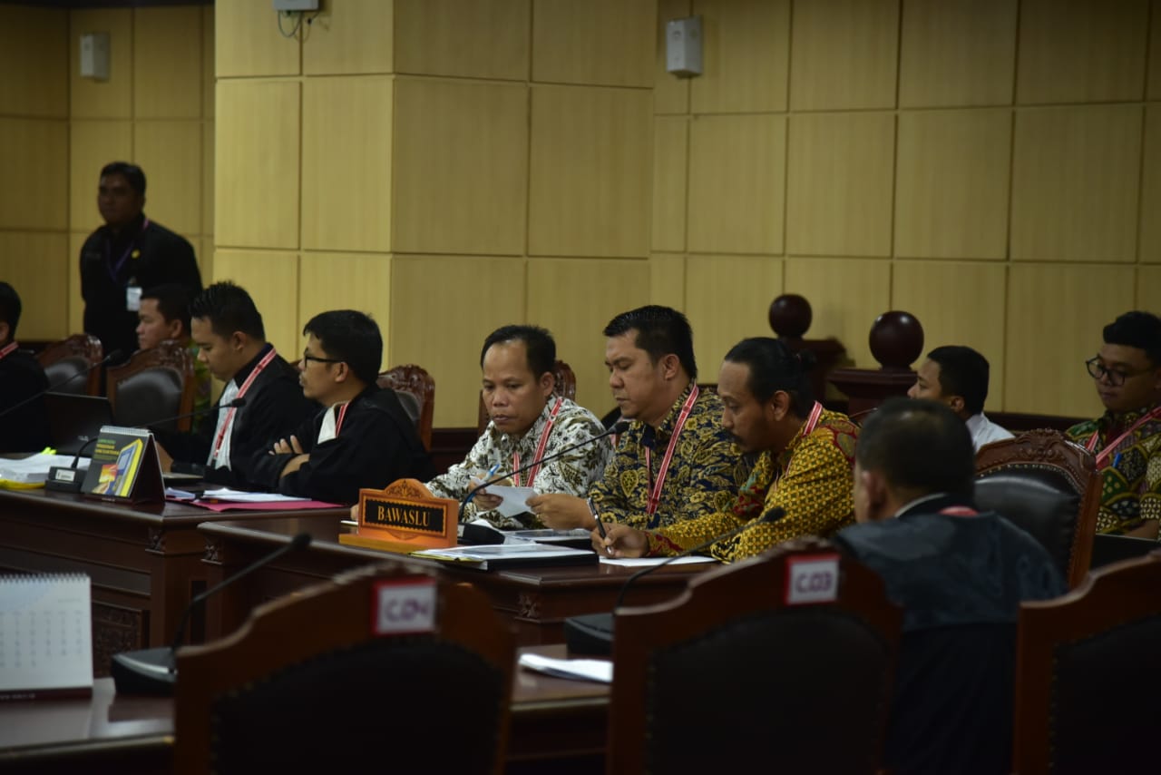 Jakarta, Badan Pengawas Pemilihan Umum — Koordintor Divisi Hukum Bawaslu Bengkulu Dodi Herwansyah memberikan keterangan dalam sidang sengketa hasil pemilihan legislatif (pileg) terhadap gugatan Partai Kebangkitan Bangsa (PKB). Pemohon melaporkan dugaan delapan orang pemilih tambahan (DPTb) yang tidak dapat menunjukkan formulir model A5 di TPS 2, Desa Tanjung Agung, Kecamatan Seginim, Kabupaten Bengkulu Selatan.