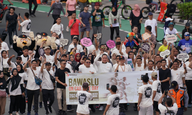 "Bawaslu hadir mengawasi demi memberikan garansi pemilu dilaksanakan secara berintegritas dan bermartabat. Sambil bersama-sama berjalan dengan rakyat mari kita mengawasi pemilu," katanya sebelum melakukan jalan santai mengitari Jalan MH Thamrin hingga bundaran Hotel Indonesia.