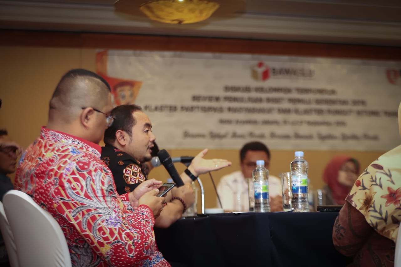 Jakarta, Badan Pengawas Pemilihan Umum - Guna menggaungkan pemilu berbudaya, kreatif, dan inovatif, Bawaslu menggelar acara Diskusi Kelompok Terpumpun Review Penulisan Riset Pengawasan Pemilu Serentak2019 Klaster Partisipasi Masyarakat dan Kalster Pungut Hitung Tahap I di Jakarta, Rabu (25/9/2019) malam.
