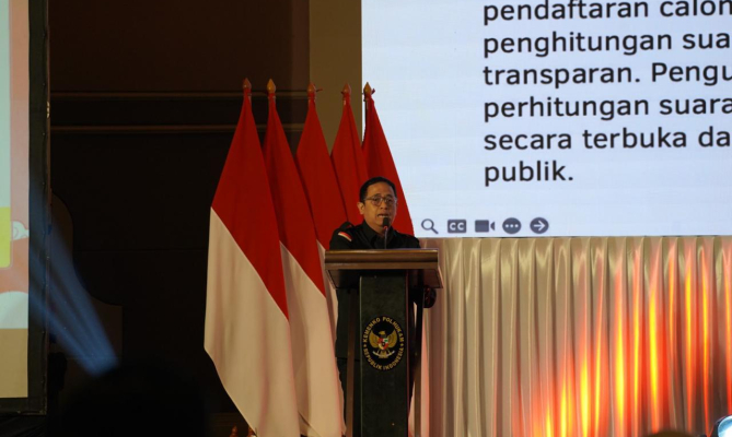 Anggota Bawaslu Puadi dalam Forum Koordinasi Sentra Penegakan Hukum Terpadu (Gakkumdu) se-Jawa, Nusa Tenggara, dan Papua di Yogyakarta, Kamis (22/08/2024).