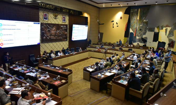 Jakarta, Badan Pengawas Pemilihan Umum– Bawaslu menghadiri rapat dengar pendapat (RDP) bersama Komisi II DPR RI, Kementerian Dalam Negeri (Kemendagri), KPU, dan DKPP yang membahas tahapan dan jadwal Pemilu Serentak 2024. Forum RDP menyepakati rancangan Peraturan KPU (PKPU) tentang Jadwal Tahapan dan Jadwal Penyelenggaraan Pemilu Tahun 2024 yang mana tahapan Pemilu 2024 akan dimulai pada 14 Juni 2022.