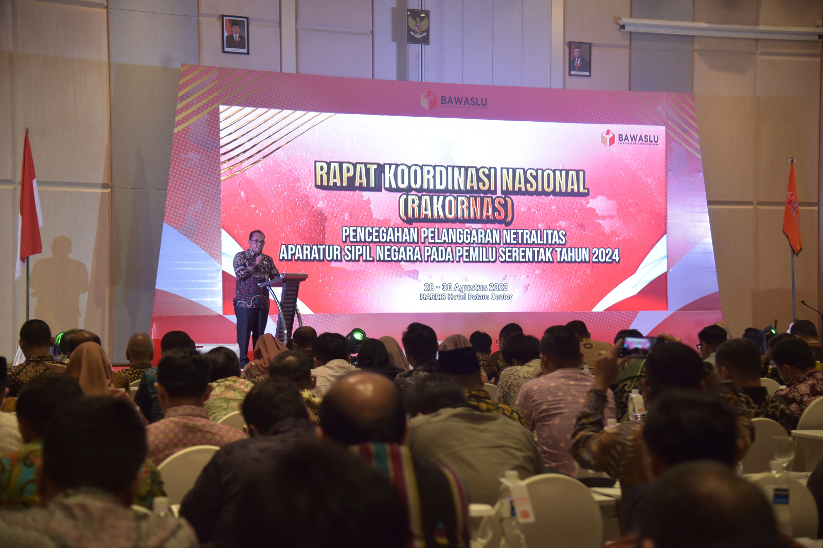 Deputi Bidang Dukungan Teknis La Bayoni saat membuka kegiatan Rakornas Pencegahan Pelanggaran Netralitas Aparatur Sipil Negara (ASN) Pemilu Serentak Tahun 2024 pada Senin, (28/8/2023) di Batam, Kepulauan Riau.