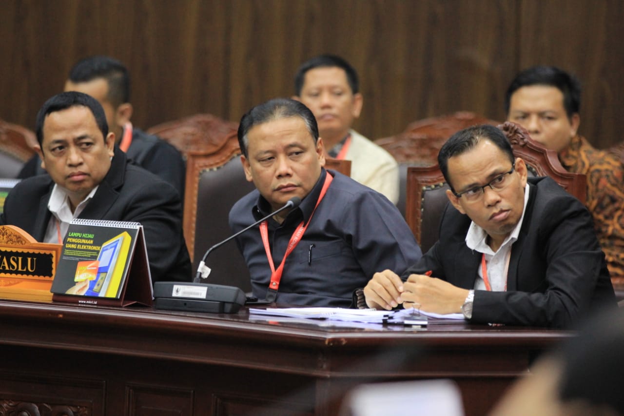 Ketua Bawaslu DKI Jakarta Muhammad Jufri (kanan) didampingi Ketua Bawaslu Abhan (tengah) saat menghadiri sidang pendahuluan sengketa hasil pileg di Gedung MK, Rabu 10 Juli 2019/Foto: Hendi Purnawan