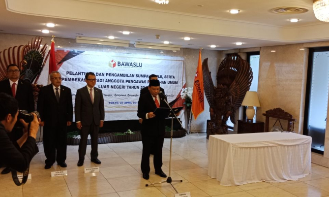 Tokyo, Jepang, Badan Pengawas Pemilihan Umum – Ketua Bawaslu RI , Abhan melantik sembilan orang Panitia Pengawas Pemilihan Umum (Panwaslu) Luar Negeri yang akan bertugas mengawasi pelaksanaan pemilu 2019 di perwakilan Tokyo, Osaka, dan Taipei pada Jumat (27/4/2018) di Tokyo, Jepang. Usai dilantik, seluruh Panwaslu LN akan diberikan peningkatan kapasitas melalui kegiatan Bimbingan Teknis (bimtek) mengenai pemilu dan pengawasan pemilu.