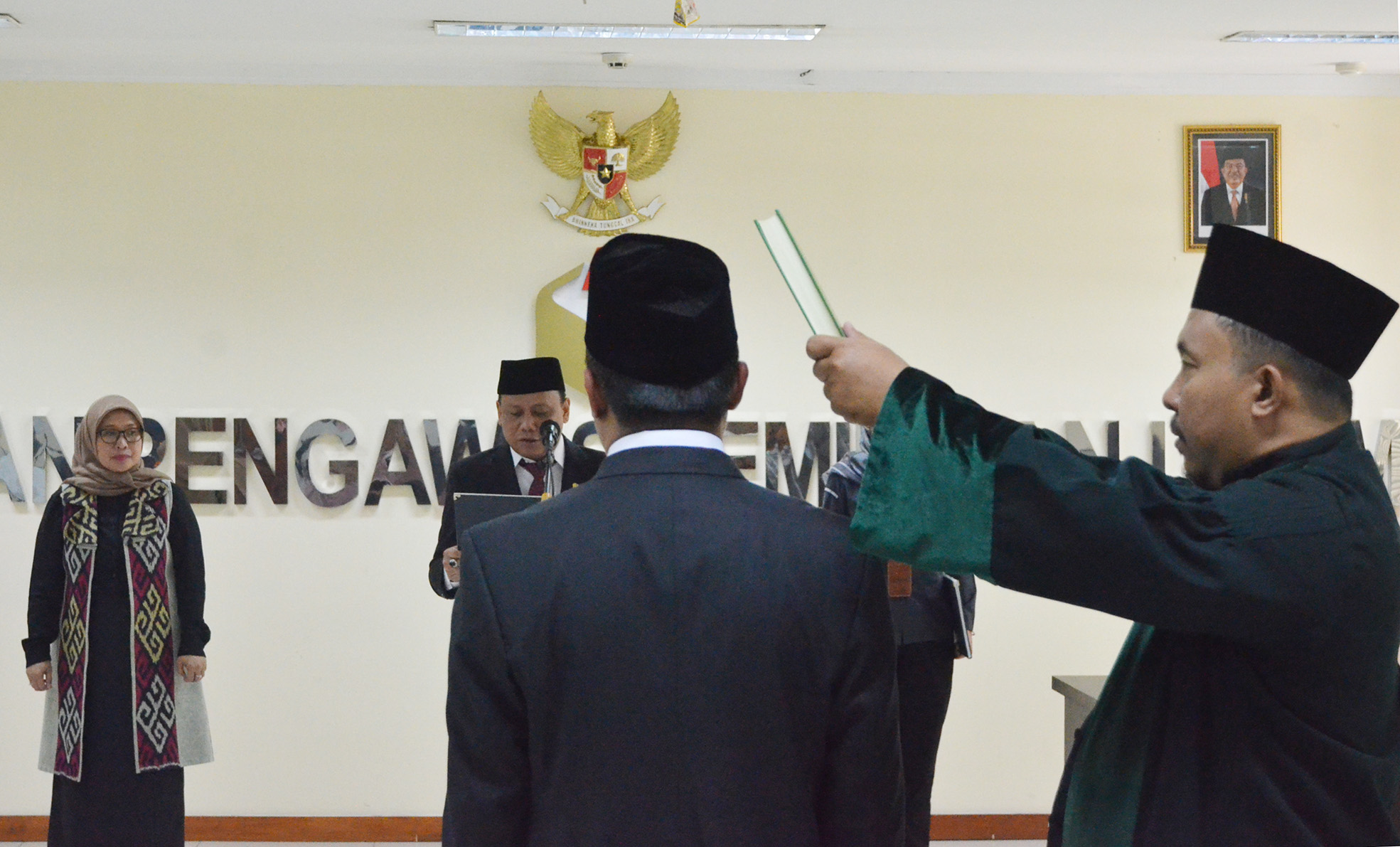 Jakarta, Badan Pengawas Pemilu – Ketua Bawaslu RI Abhan melantik dan mengambil sumpah dan janji Pengganti Antar Waktu (PAW) Anggota Panitia Pengawas Pemilihan (Panwaslih) Provinsi Aceh, Naidi Faisal masa jabatan 2019-2023, di Gedung Bawaslu, Jl. MH Thamrin No. 14, Jakarta, Senin (8/4/2019). Pelantikan Naidi Faisal menggantikan anggota Panwaslih Aceh yang lama berdasarkan Putusan DKPP Nomor 249/DKPP-PKE-VII/2018 yang menjatuhkan sanksi berupa pemberhentian tetap.