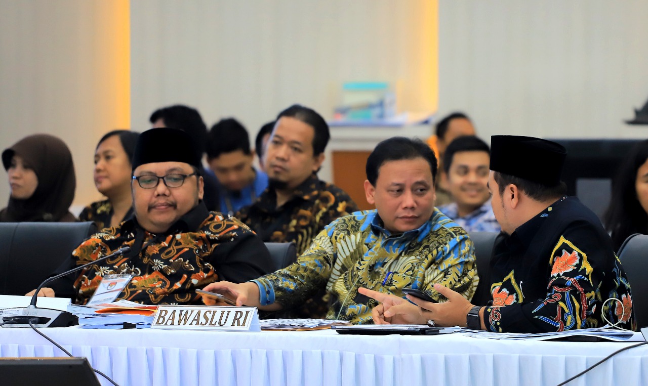 Ketua Bawaslu Abhan berbincang dengan anggota Bawaslu Mochamad Afifuddin saat melakukan pengawasan proses rekapitulasi suara untuk provinsi Jawa Timur di KPU, Jakarta, Selasa 14 Mei 2019/Foto: Nurisman