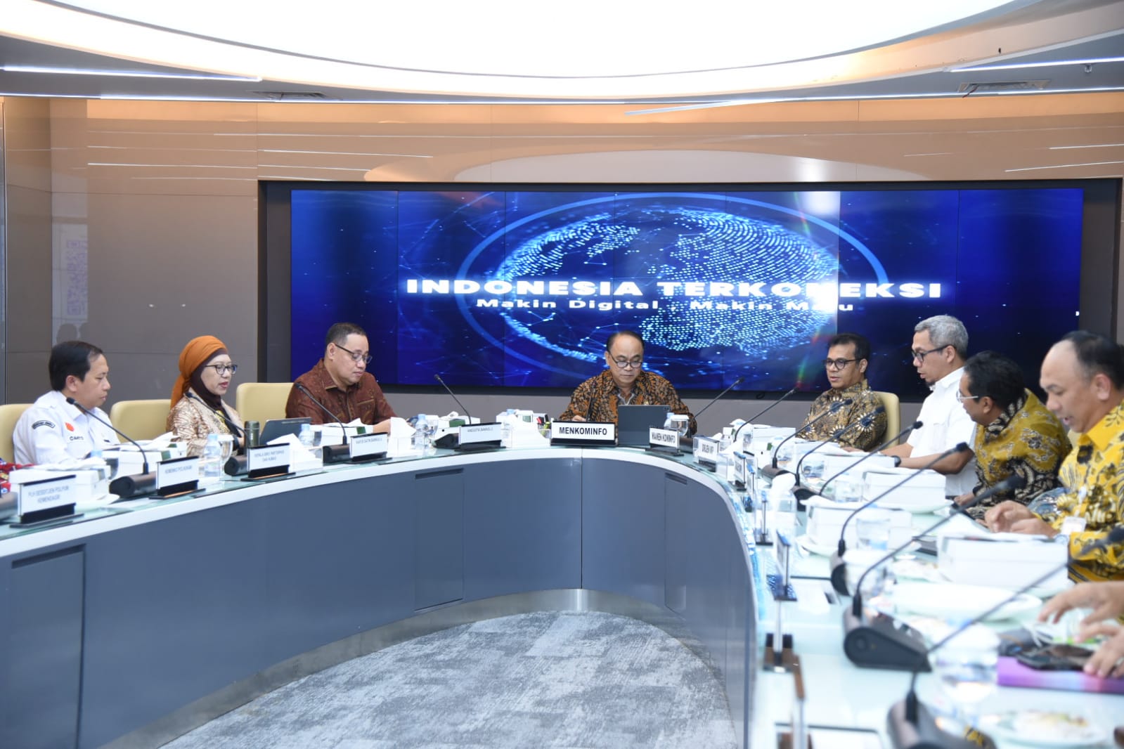 Anggota Bawaslu Herwyn JH malonda (ketiga dari kiri) bersama Menkominfo Budi Ari Setiadi (tengah) berdiskusi terkait penangkalan konten hoaks dan disinformasi di Kantor Kominfo, Jakarta, Kamis (14/9/2023)/foto: Publikasi dan Pemberitaan Bawaslu.