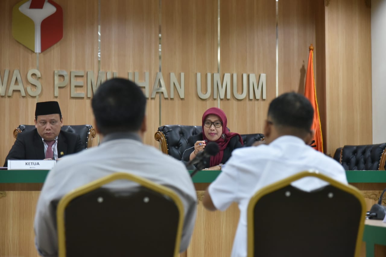 Ketua Majelis Bawaslu Abhan didampingi Anggota Majelis Ratna Dewi Pettalolo meminta keterangan dua saksi pelapor dalam dugaan pelanggaran adminitrasi pileg DPRD Kalbar di Ruang Sidang Bawaslu, Jakarta, Selasa 27 Agustus 2019/Foto: Reyn Gloria