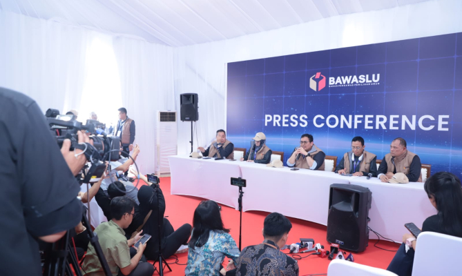Ketua dan Anggota Bawaslu RI pada keterangan pers di bilangan Monas, Jakarta, Rabu (20/11/2024).