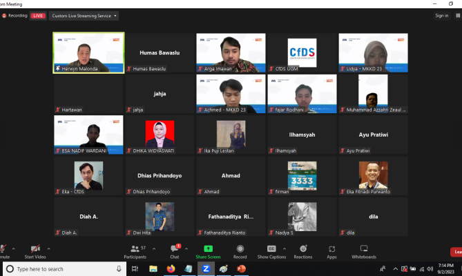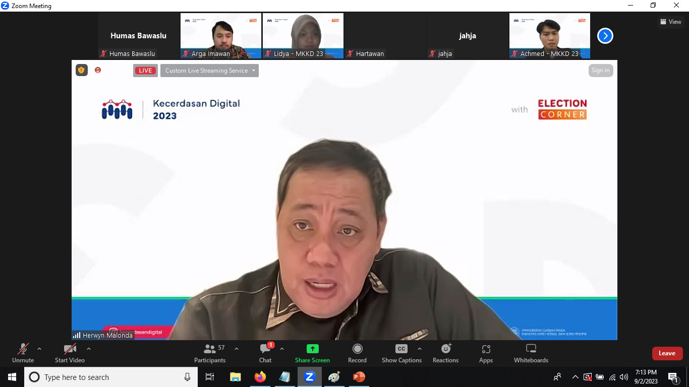 Anggota Bawaslu Herwyn JH Malonda saat menjadi pengajar di kegiatan Mata Kuliah Kecerdasan Digital Lanjutan: Pemilu dan Transformasi Digital 2023 yang digelar Universitas Gaja Mada (UGM), Sabtu (2/9/2023) secara daring/foto: tangkapan layar zoom.