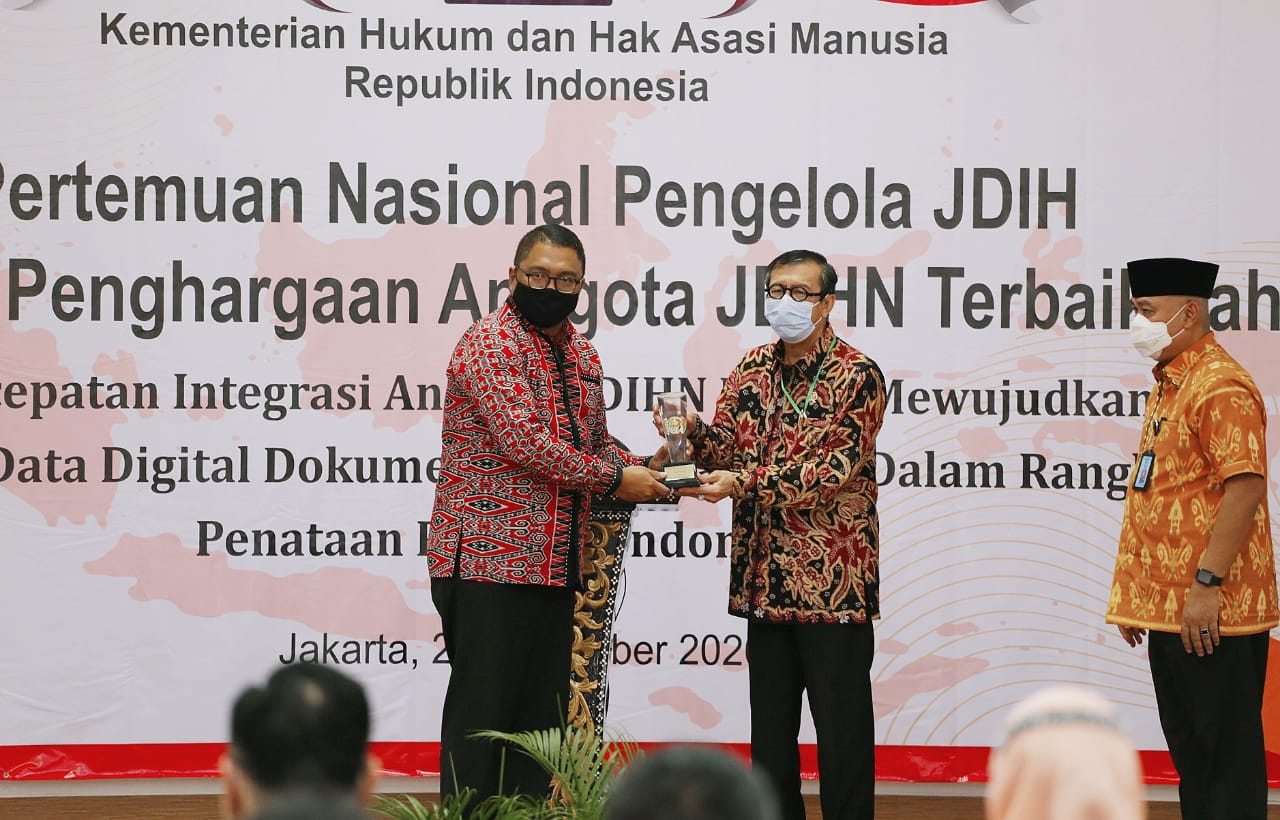 Anggota Bawaslu Fritz Edward Siregar menerima anugerah JDIH Awards 2020 yang diserahkan oleh Menkumham Yasonna Laoly di Jakarta, Kamis (26/11/2020)/foto: Nurisman (Humas Bawaslu RI).