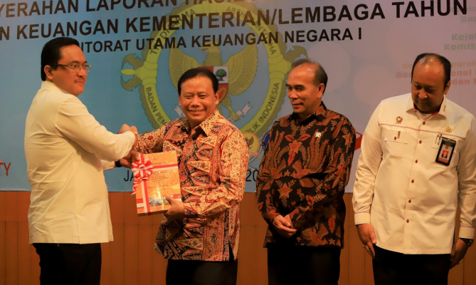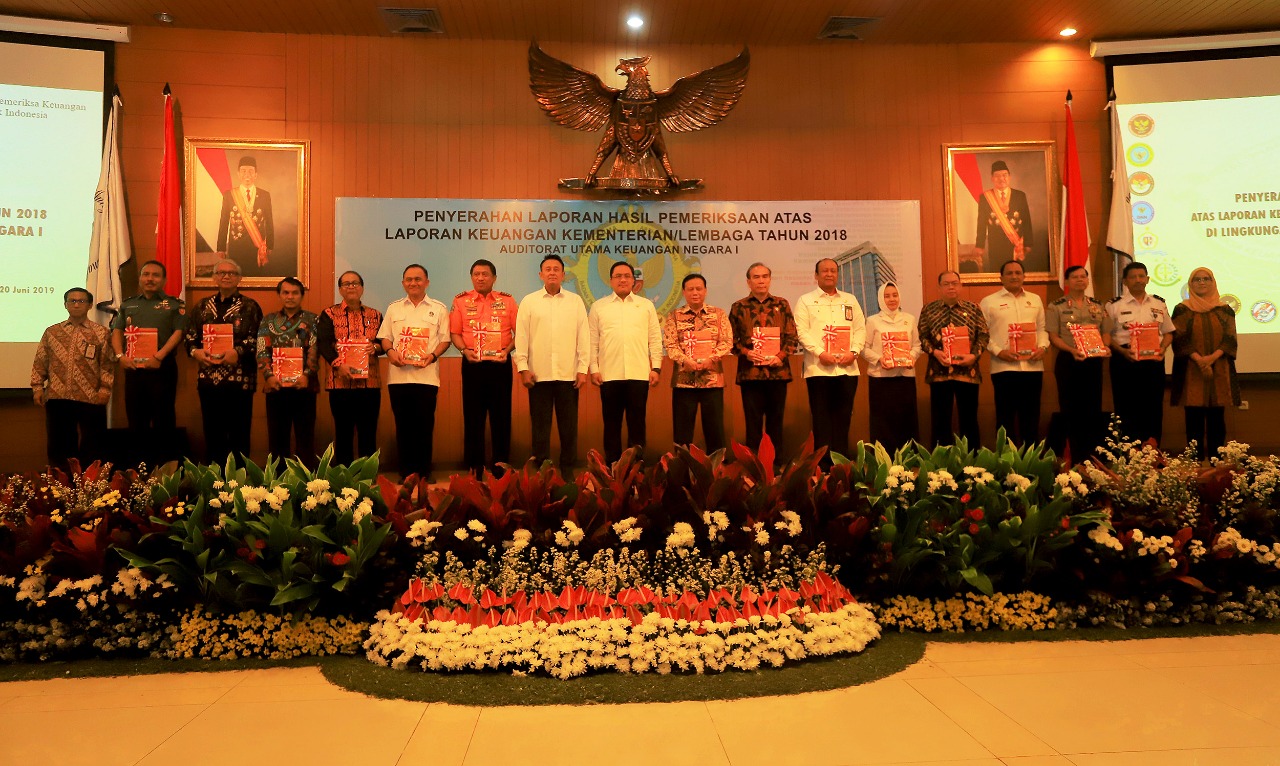 Ketua Bawaslu Abhan menerima opini WTP atas Laporan Hasil Pemeriksaan (LHP) Laporan Keuangan Kementerian/Lembaga tahun 2018 dari Anggota I BPK Agung Firman Sampurna di Auditorium Bandiklat BPK RI, Kalibata, Jakarta, Kamis (20/6/2019).