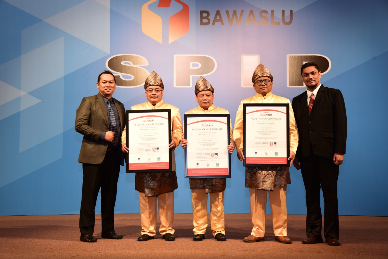 Palembang, Badan Pengawas Pemilihan Umum - Bawaslu meraih Sertifikat Sistem Manjemen Mutu ISO 9001 : 2015 dari Sertifikat System Manajemen Mutu Badan Sertifikasi Internasional Quay Audit dari United Kingdom Limited Company.