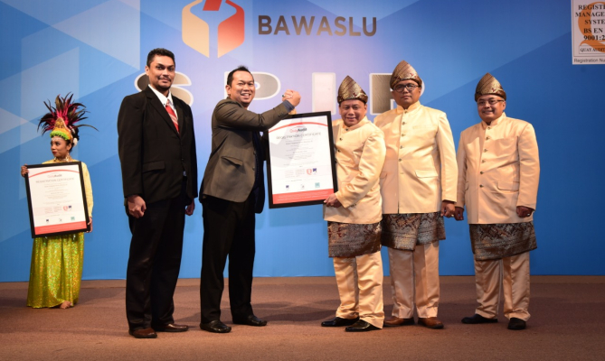 Penghargaan tersebut diberikan atas komitmen Bawaslu terhadap peningkatan mutu kinerja secara keseluruhan dan peningkatan lembaga berdasarkan standar internasional. Sertifikat diserahkan directur ICE CERT, Ashary, kepada Ketua Bawaslu, Abhan pada kegiatan SPIP di Palembang, Kamis (22/11/2018).