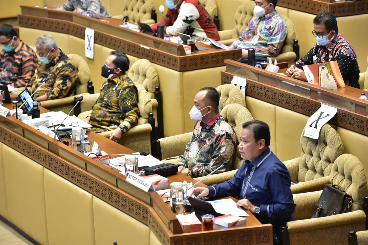 Ketua Bawaslu Abhan (batik biru) didampingi Anggota Bawaslu Ratna Dewi Pettalolo, Fritz Edward Siregar, dan Mochammaf Afiffudin menghadiri rapat dengar pendapat (RDP) dengan komisi II terkait data kependudukan untuk Pilkada serentak 2020 di Gedung DPR, Jakarta, Kamis (26/11/2020)/foto: Reyn Gloria (Humas Bawaslu RI).
