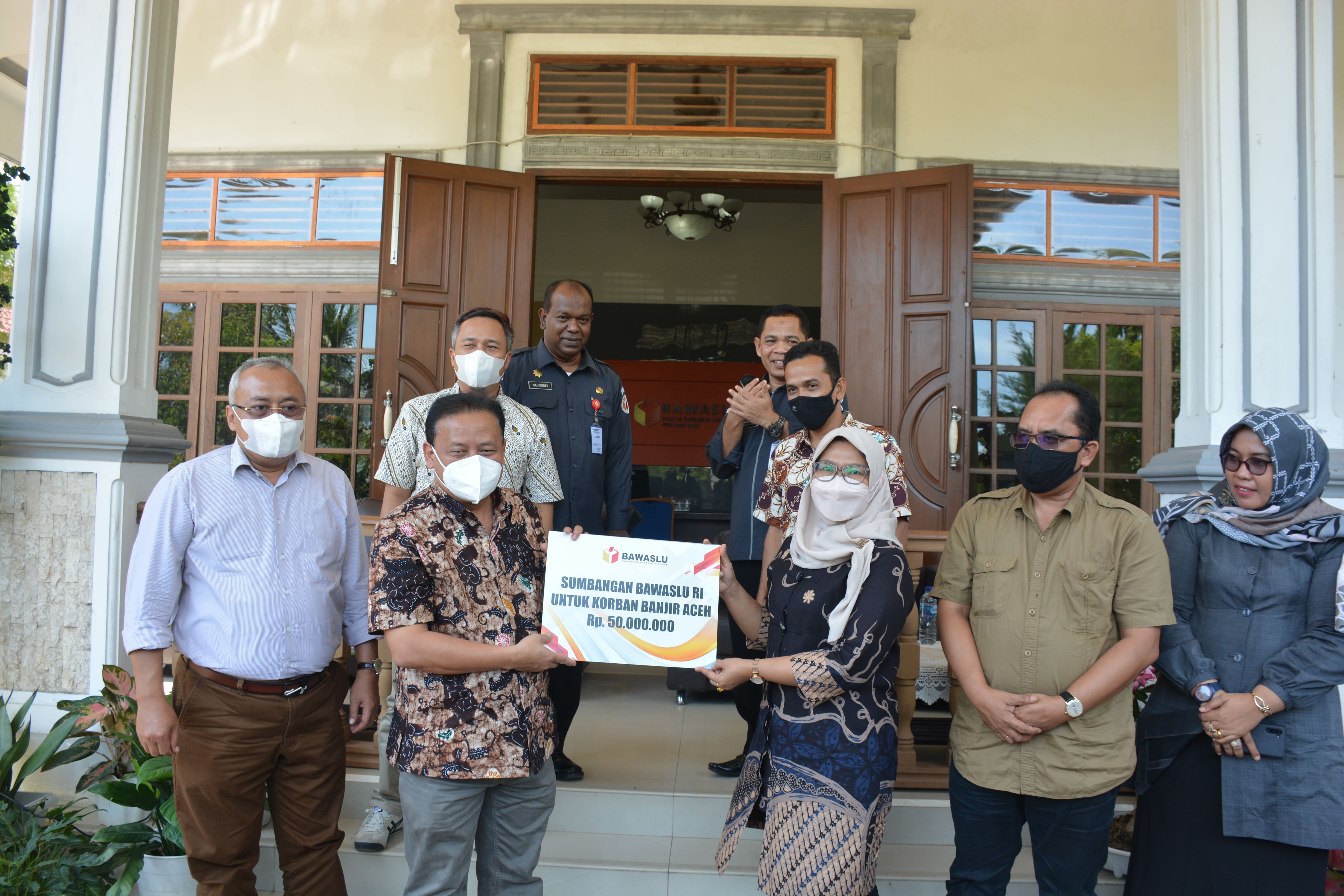 Ketua Bawaslu Abhan dan Sekretaris Jenderal (Sekjen) Bawaslu Gunawan Suswantoro menyerahkan bantuan bagi korban banjir Aceh, khususnya bagi keluarga besar Panwaslih Kabupaten/Kota terdampak,  diantaranya di Kabupaten Aceh Utara, Aceh Timur, Aceh Tamiang, dan Aceh Tenggara, Selasa (11/1/2022). Secara simbolis penyerahan bantuan disampaikan langsung oleh Abhan kepada Ketua Panwaslih Provinsi Aceh untuk diserahkan kepada pihak yang berhak.