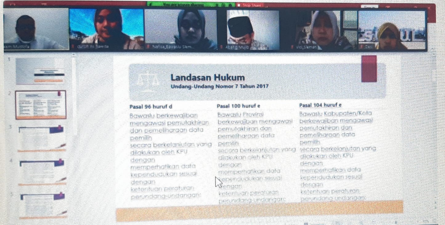 Sleman, Badan Pengawas Pemilihan Umum - Bawaslu Kabupaten Sleman melakukan evaluasi pengawasan daftar pemilih berkelanjutan (DPB) secara virtual. Ketua Bawaslu Sleman, Abdul Karim Mustofa menyampaikan pengawasan pemutakhiran DPB merupakan amanat dari Undang-Undang. Pasca pelaksanaan Pemilihan Bupati dan Wakil Bupati Sleman Tahun 2020, Bawaslu Sleman tetap melakukan pengawasan, khususnya terkait pemutakhiran DPB yang dilaksanakan oleh KPU Sleman.