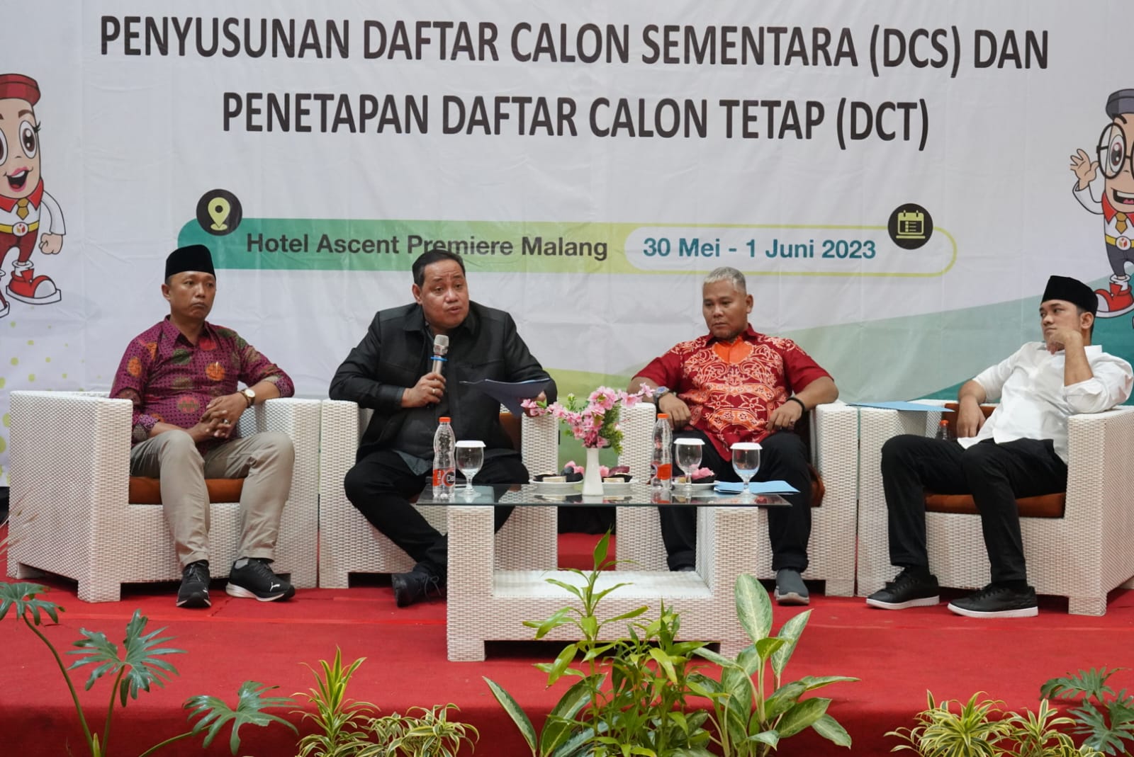 Anggota Bawaslu Herwyn JH Malonda (kedua dari kiri) memberikan arahan dalam Diskusi Kelompok Terpumpun Mitigasi Resiko Pengawasan Sub Tahapan Verifikasi Administrasi Penyusunan Daftar Calon Sementara (DCS) dan Penetapan Daftar Calon Tetap (DCT) di Malang, Jawa Timur, Rabu, (31/6/2023)/foto: Publikasi dan Pemberitaan Bawaslu.